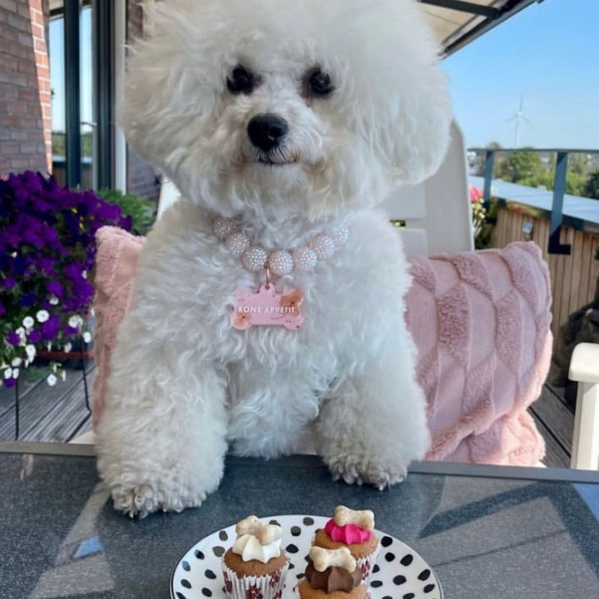 A trio of vanilla sponge mini Woofins, decorated with a dash of our famous yoghurt topping in vanilla, carob and playful pink. Finished with a doggy crunchy bone biscuit in a paw print muffin wrapper.