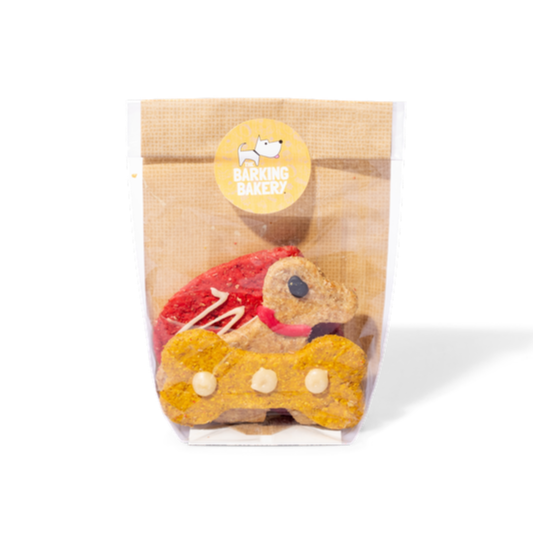 Each biscuit is lovingly handmade in our on-site bakery using only the finest, dog safe, human-grade ingredients and decorated to give each one a personalised touch. Packaged in a food safe bag to keep them fresh.