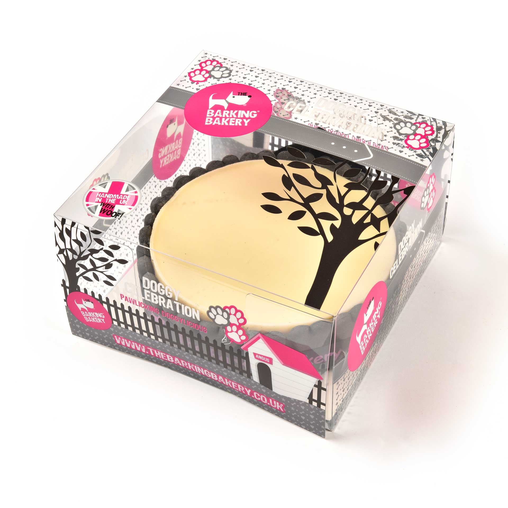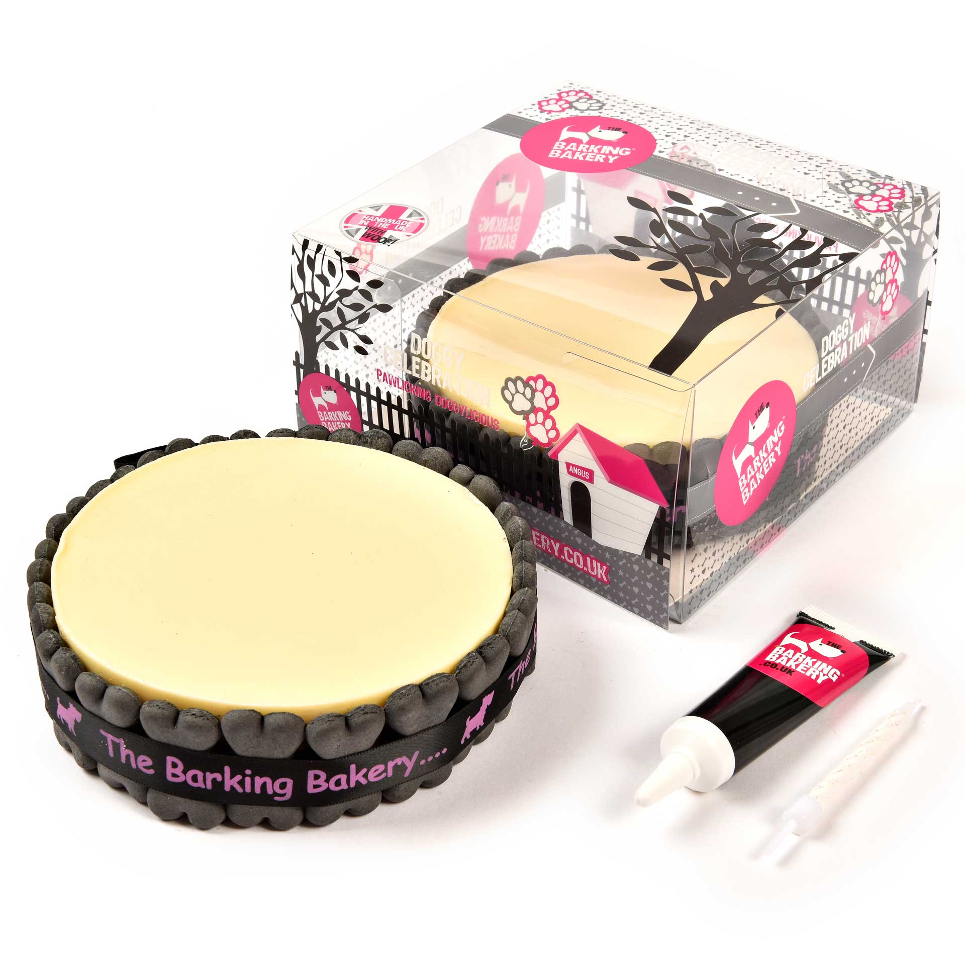 The Plain Party sized (6inch) Doggy Occasion Sponge Cake, topped with our vanilla yoghurt frosting and surrounded with crunchy doggy bone shaped biscuits. Our party cakes come with an icing pen so you can write your own message, we also include a candle for cake lighting.